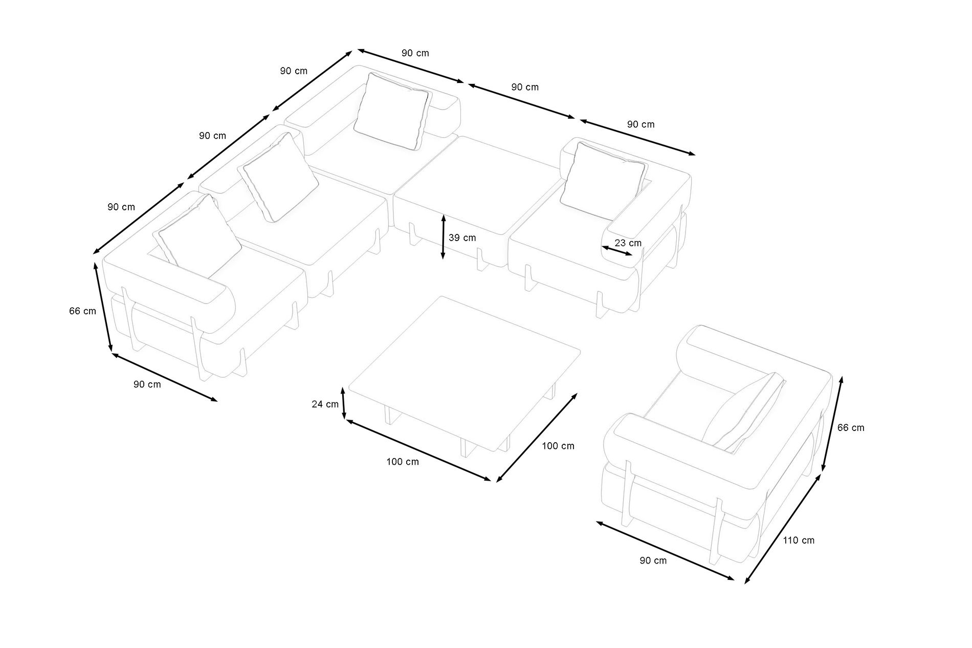 Die Maße der Module unterstreichen den großzügigen Charakter dieses Sets: Die Sofaelemente und der Hocker messen jeweils ca. 90 x 90 cm, der Sessel ca. 111 x 90 x 67 cm. Der Loungetisch mit einer Höhe von ca. 23 cm und einer Tischplatte von ca. 100 x 100 cm fügt sich perfekt in das Gesamtbild ein und bietet Platz für Getränke, Snacks oder Dekoration.